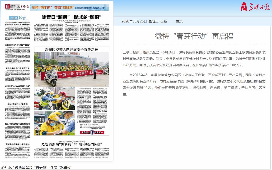 2020年05月26日,三峽日報第6版刊登消息《微特“春芽行動”再啟程》,介紹了微特聯合智慧谷孵化器熱心企業來到五峰土家族自治縣長...