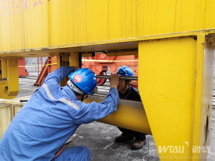 微特的技術(shù)工程師正在對向家壩電廠右岸進(jìn)水口3200KN門機(jī)液壓抓梁加裝水下穿銷傳感器
