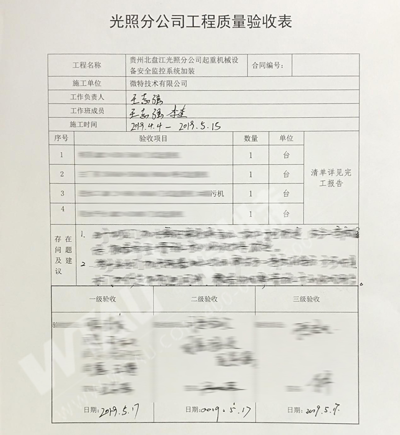 貴州北盤江光照分公司安全監(jiān)控系統(tǒng)加裝項(xiàng)目在客戶要求定檢時間前完工并且一次性通過電廠內(nèi)部三級驗(yàn)收且無整改項(xiàng)目,驗(yàn)收現(xiàn)場得到客戶肯定。同時,項(xiàng)目已順利通過黔西南特種設(shè)備監(jiān)督檢驗(yàn)。