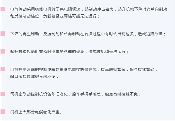 金銀臺樞紐1250T雙向門機電氣控制系統于2012年投運至今已有8年,控制系統元器件老化,部分元器件已停產,無法提供備件,控制線路老化,可靠性降低,影響設備安全運行,無法滿足設備安全生產的需要。原控制系統設計性能差,操作系統容易出故障,啟動沖擊較大,平穩性差。據現場調研主要存在以下問題: