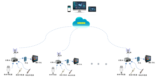 起重設(shè)備上采集數(shù)據(jù)送至系統(tǒng)主機(jī)處理、顯示、報(bào)警完成現(xiàn)地監(jiān)控功能。同時(shí)采集的數(shù)據(jù)可以通過4G網(wǎng)絡(luò)同步至云服務(wù)器存儲(chǔ)。可以通過預(yù)測性系統(tǒng)云平臺(tái)進(jìn)行集中管理,實(shí)現(xiàn)設(shè)備運(yùn)維管理的信息化和智能化。