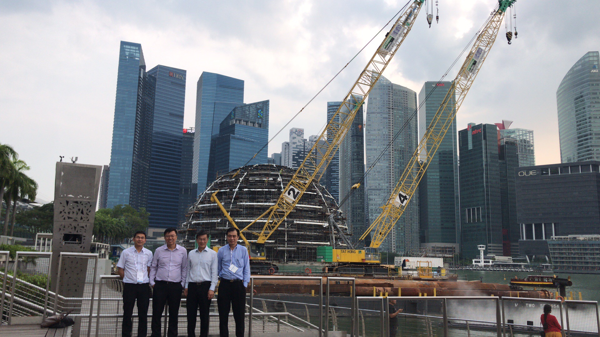 ▲微特事業部總經理與新加坡達豐公司在會場外的工地現場合影,背后正在施工的吊車上安裝的正是微特的力矩限制器產品