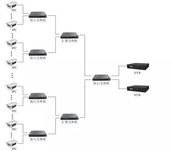 針對于50個點以上的中大型工程,需要采用三層網絡架構:接入層、匯聚層、核心層。同時由于點位較多,對核心層交換機的性能要求較高,一般這種情況下需選擇華為或華三等知名廠家的三層全千兆核心交換機(大家熟悉的普聯系列不推薦)。