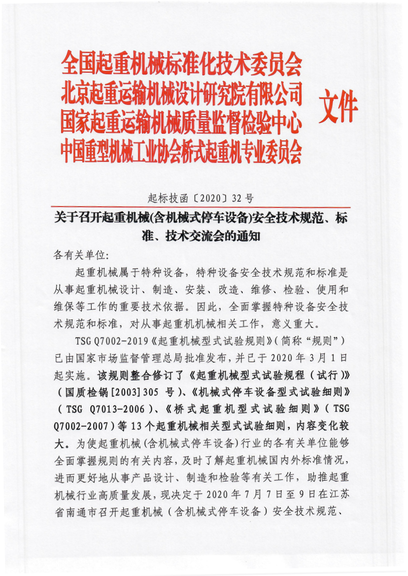 日前,由全國(guó)起重機(jī)械標(biāo)準(zhǔn)化技術(shù)委員會(huì)、北京起重運(yùn)輸機(jī)械設(shè)計(jì)研究院有限公司、國(guó)家起重運(yùn)輸機(jī)械質(zhì)量監(jiān)督檢驗(yàn)中心以及中國(guó)重型機(jī)械工業(yè)協(xié)會(huì)橋式起重機(jī)專(zhuān)業(yè)委員會(huì)聯(lián)合下發(fā)文件,定于2020年7月7日至9日召開(kāi)起重機(jī)械(含機(jī)械式停車(chē)設(shè)備)安全技術(shù)規(guī)范、標(biāo)準(zhǔn)組織、技術(shù)交流會(huì)。