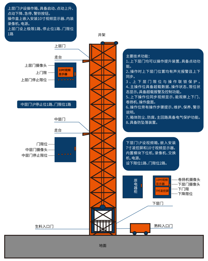 物料提升機(jī)是一種固定裝置的機(jī)械輸送設(shè)備,主要適用于粉狀、顆粒狀及小塊物料的連續(xù)垂直提升,設(shè)置了斷繩保護(hù)安全裝置、停靠安全裝置、緩沖裝置、上下高度及極限限位器、防松繩裝置等安全保護(hù)裝置。