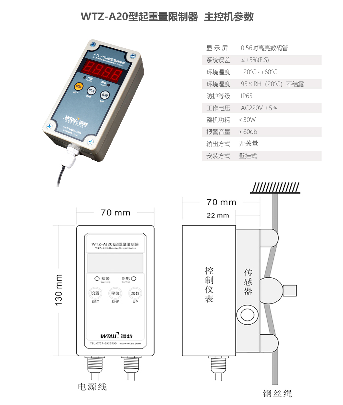 WTZ-A20起重量限制器用于一路重量信號監測,適用于升降機、電動葫蘆等鋼絲繩置吊的起重設備。該型號儀表可替換WTZ-A50、WTZ-A60起重量限制器使用。