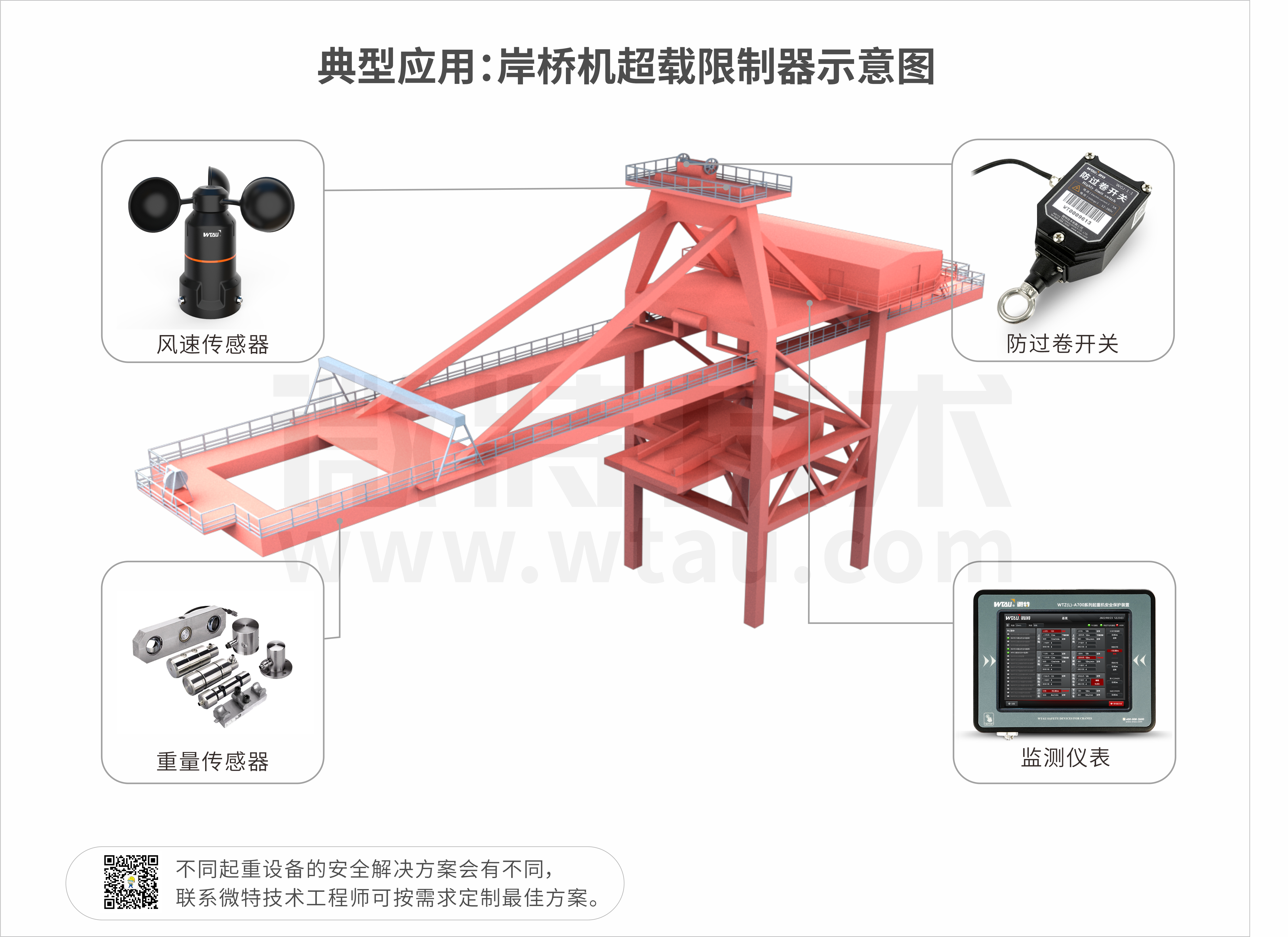 WTZ-A700起重量限制器適用于各類大型橋門式起重機,如:大型通用橋式起重機(岸橋機、場橋機)、冶金橋機、單雙梁橋機、裝卸橋機,大型龍門吊、壩頂門機、纜索吊等。